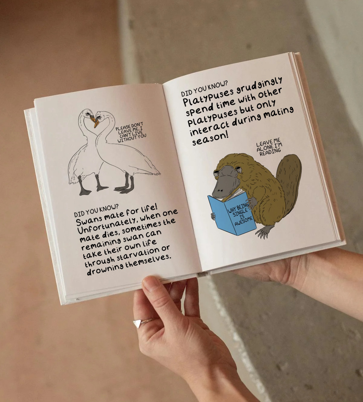 During my final year of University, I created a self directed brief which focuses on anthropomorphism. I wanted to tackle into various human traits and compare them to animals in the form of a fun fact book! This book took traits such as love, immunity, mating (and many more!) and compared two extremely different animals. This book is also child friendly and has engaging illustrations relating to the trait being mentioned. Below are a few concept images I mocked up before producing the real book!